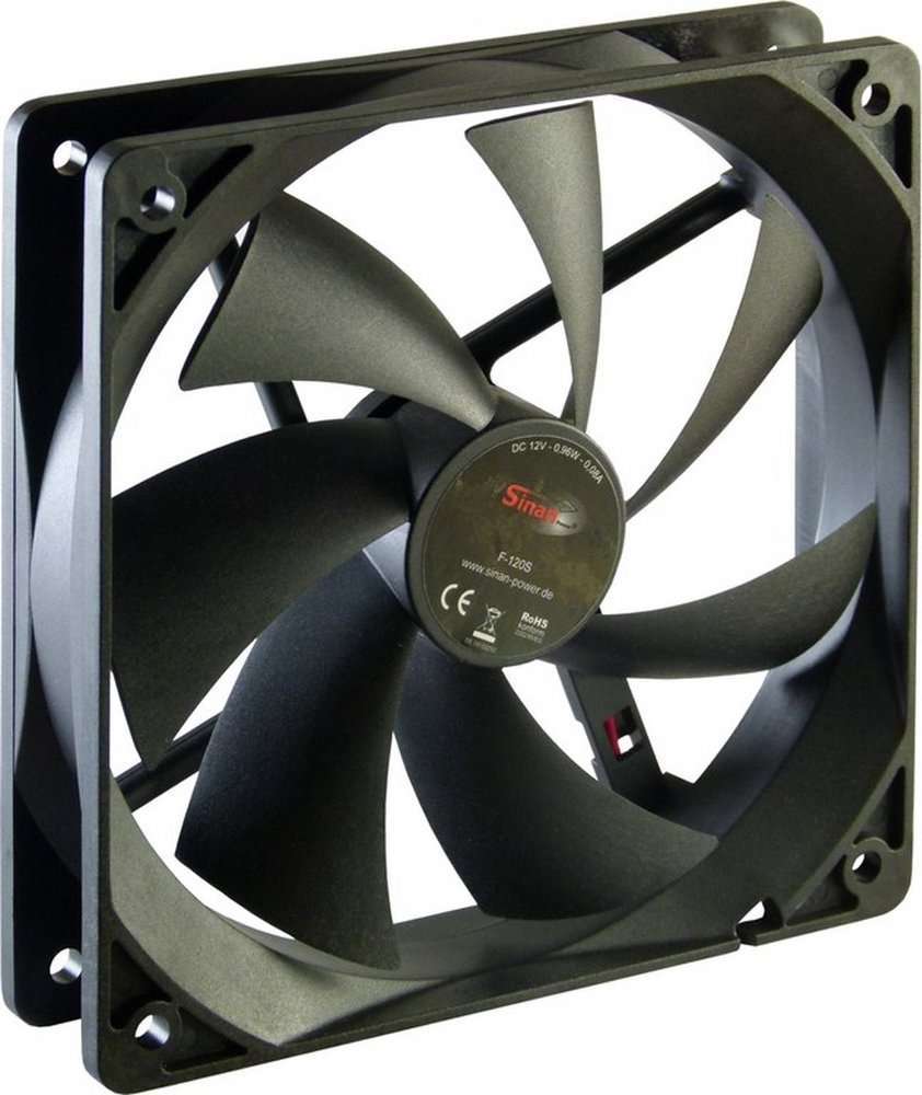 Inter-Tech F-120-S. Soort: Ventilator, Ventilator diameter: 12 cm, Rotatiesnelheid ( max): 1200 RPM, Geluidsniveau (hoge snelheid: 20 dB, Maximum luchtstroom: 90,1 cfm. Spanning: 12 V. Breedte: 120 mm, Diepte: 120 mm, Hoogte: 25 mm. Kleur van het product: Zwart