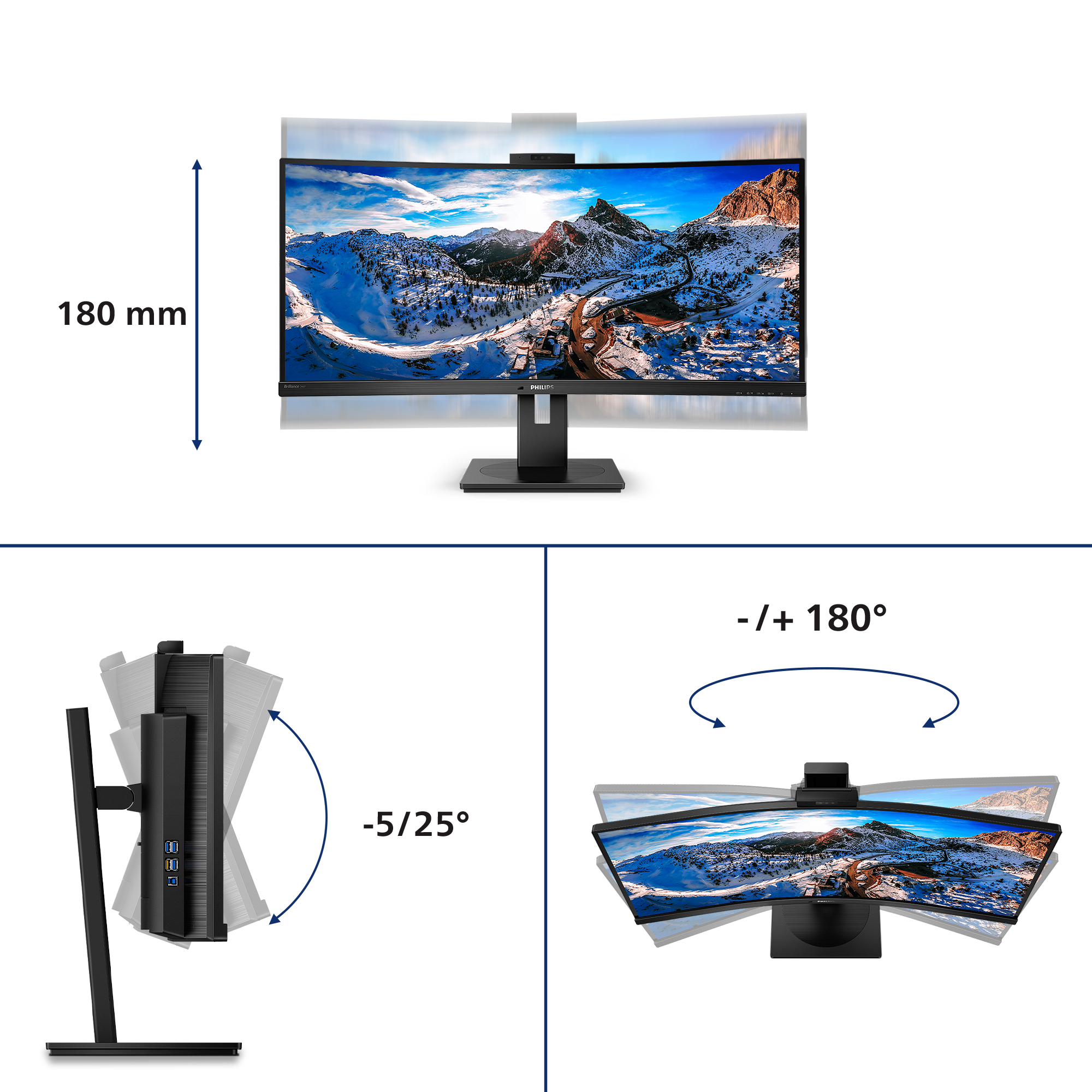 De Philips P Line 346P1CRH/00 beschikt over een gebogen scherm dat een meeslepende kijkervaring biedt. De ultrabrede beeldverhouding maakt het mogelijk om meerdere vensters naast elkaar te bekijken, wat ideaal is voor multitasking. De monitor is uitgerust met een veilige pop-upwebcam die compatibel is met Windows Hello, waardoor gebruikers eenvoudig en veilig kunnen inloggen. Dit is een belangrijke functie voor professionals die waarde hechten aan zowel beveiliging als gebruiksgemak.