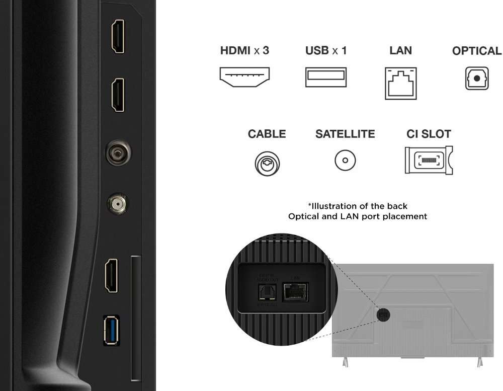 Op het gebied van geluid levert het 2.0-kanaals audiosysteem met Dolby Atmos en geavanceerde geluidsformaten een rijk en meeslepend geluid dat perfect past bij de visuele kwaliteit. Voor gaming en externe apparaten biedt de TCL 43V6C meerdere aansluitingen, waaronder drie HDMI-poorten (met HDMI 2.1 ondersteuning), een USB-poort, Ethernet LAN, Wi-Fi en Bluetooth, zodat je eenvoudig consoles, soundbars, harde schijven en andere accessoires aansluit.