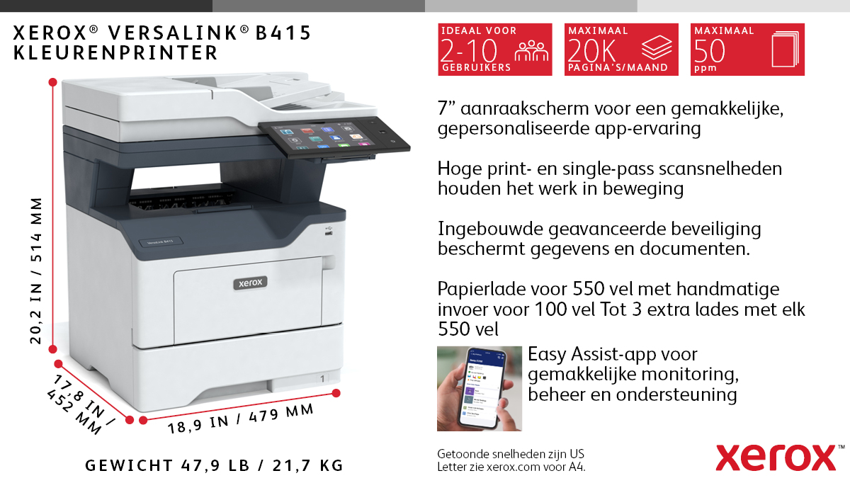 De Xerox VersaLink B415 is een A4 zwart-wit printer. Hij print tot 47 pagina’s per minuut. Voorzien van 2 laden met een capaciteit van 650 vel. Geschikt voor efficiënt en betrouwbaar afdrukken.